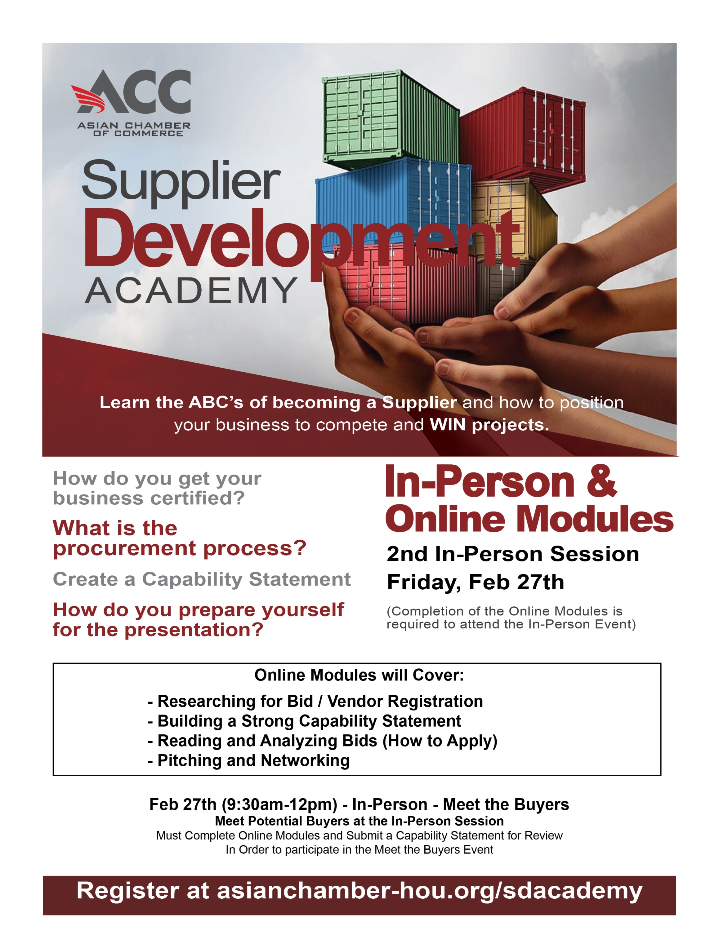 The Asian Chamber of Commerce is hosting our Supplier Development Academy to help your business win bids and learn what buyers look for in selecting suppliers. Be coached by decision makers from mayor corporations and the public sector in researching bids, learning the application process, and how to knock out a winning presentation. Meet Potential Buyers at the In-Person Sessions.FREE TO ACC MEMBERS. REGISTRATION IS REQUIRED.