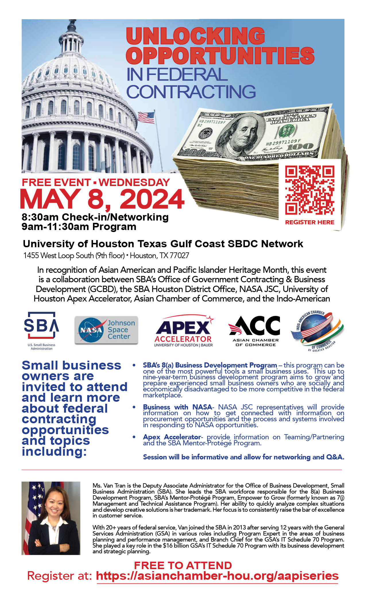 In recognition of Asian American and Pacific Islander Heritage Month, this event is a collaboration between SBA’s Office of Government Contracting & Business Development (GCBD), the SBA Houston District Office, NASA JSC, University of Houston Apex Accelerator, Asian Chamber of Commerce, and the Indo-American Chamber of Commerce!
